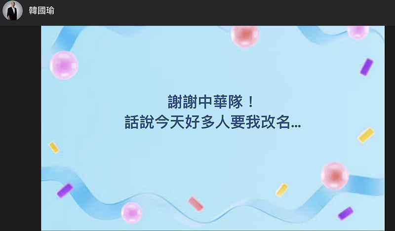 世界棒球經典賽,台灣首度打敗韓國,比數5比4。立法院長韓國瑜今(8)晚臉書玩起諧音梗說,「謝謝中華隊!話說今天好多人要我改名…」。