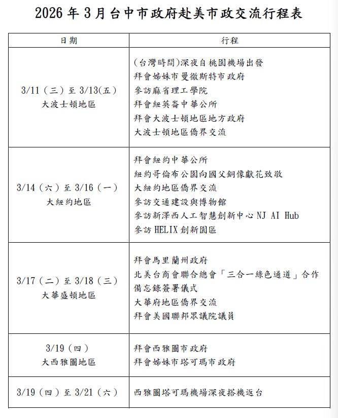 台中市政府今(9)日公布市長盧秀燕3月11日至21日訪問美國11天行程,包括波士頓、紐約、華盛頓、西雅圖四大地區,期間並將拜會美國聯邦眾議院議員、多個州政府與市政府,並與僑界交流。