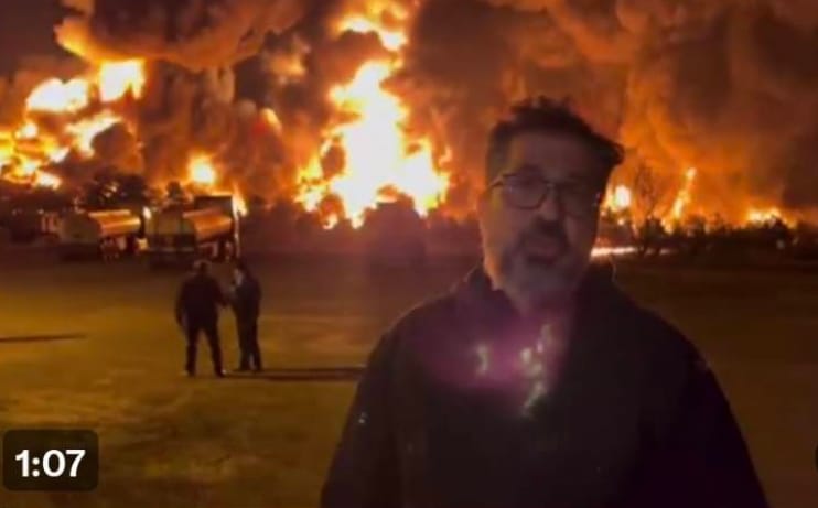 一名記者在燃燒的油庫前,報導美以聯軍此次針對伊朗能源、軍事設施的襲擊。 推主 NiKITa 分享於 X