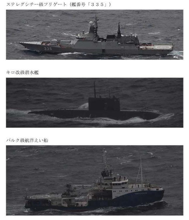 通報稱俄羅斯1艘基洛改級(Improved Kilo-class,636.3型)潛艦在「守護級」(Steregushchiy class,20380計畫)巡防艦「響亮號(Gromkiy,舷號335)」及23470型海上拖船的伴隨下,5日深夜通過對馬海峽(Tsushima Strait)進入東海,9日再由與那國島與西表島之間海域,進入太平洋。日本出動P-3C巡邏機從那霸基地起飛進行警戒監視與情報蒐集。