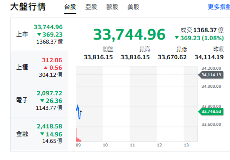 台股今天(12日)開黑跌逾369點,最低來到33670點。上櫃揚升、電子融類股走跌。約9點20分前,台積電跌40元、來到1900元。鴻海跌3元、來到216元。廣達平盤維持289元。台達電跌25元、來到1375元。聯發科跌30元、來到1740元。