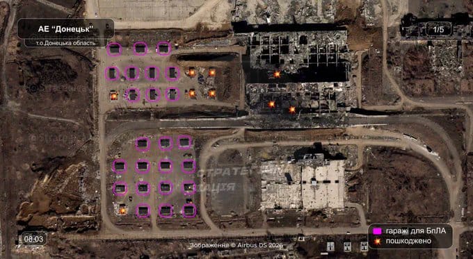 俄軍在頓涅茨克國際機場週邊設置的無人機機庫與彈藥庫也遭烏軍襲擊。 推主 愛俄小能手 分享於 X
