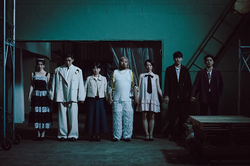 死亡之握迷因成真,舊同學玩招鬼遊戲犯禁忌,左起睦媄、初孟軒、嚴正嵐、美麗本人、林子熙、涂善存、歐陽倫。 圖:網銀國際影視/提供