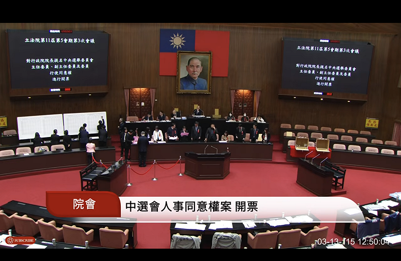 立法院今(13)日中午行使中選會人事同意權投票,主委被提名人游盈隆獲朝野3黨共同支持過關。而藍白分別推薦的李禮仲、蘇嘉宏、薦蘇子喬也過關。不過,副主委被提名人胡博硯及委員黃文玲與陳宗義,可能被認為立場偏綠,都遭藍白封殺。
