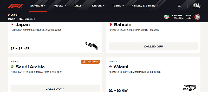 世界一級方程式賽車(F1)的管理機構國際汽車聯盟(FIA)今天宣布,受到美國及以色列與伊朗爆發戰爭的影響,原定在巴林與沙烏地阿拉伯舉行的F1大獎賽已被取消。