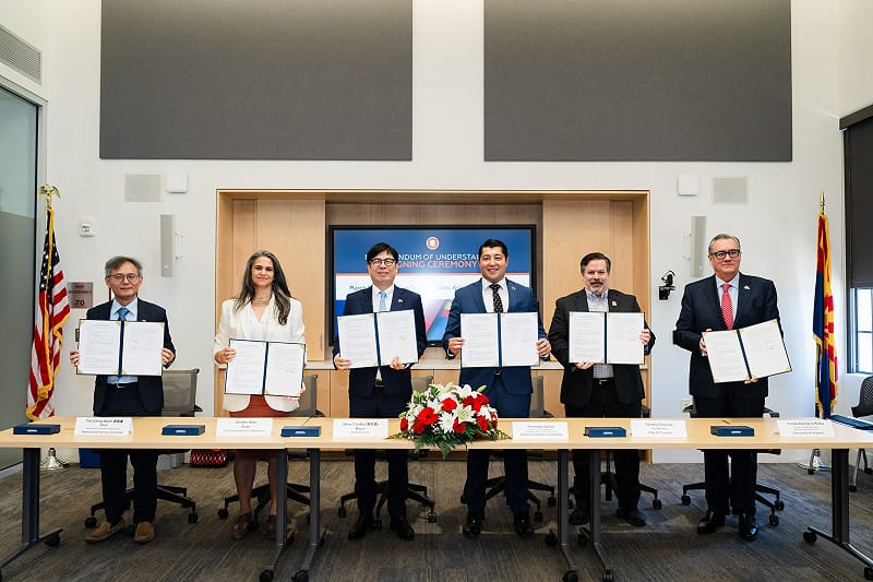 繼與亞利桑那州政府、日本熊本縣簽署三方經濟交流促進備忘錄後,高雄市長陳其邁馬不停蹄率領市府團隊,前往亞利桑那州第二大城、也是南部最大城市「光學之谷」土桑市(Tucson),與亞利桑那州商務廳、皮馬郡府、土桑市政府、亞利桑那大學及國立中山大學,共同在當地指標性歷史建築皮馬郡歷史法院簽署「六方半導體生態系與全球人才夥伴合作備忘錄」。陳其邁指出,台美日確立半導體戰略三角後,此次拜會暨簽署六方MOU更象徵高雄與美國產官學界的合作,由州政府層級進一步落實至地方政府與學術機構,正式開啟跨國人才培育的合作契機與實質對接。