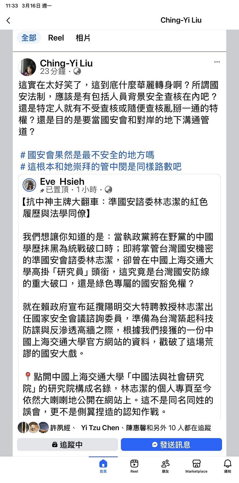 臉友「Eve Hsieh」貼文「抗中神主牌大翻車:準國安諮委林志潔的紅色履歷與法學同僚」指出,當執政黨將在野黨的中國學歷抹黑為統戰破口時;即將掌管台灣國安機密的準國安會諮委林志潔,卻曾在中國上海交通大學高掛「研究員」頭銜,這究竟是台灣國安防線的重大破口,還是綠色專屬的國安豁免權?