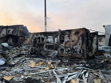 現場一棟單層建築被燒黑,明顯受火災破壞。其他地方的建築則被夷為木材與金屬堆,僅少數床鋪倖存,毯子、個人物品與床上用品散落一地。