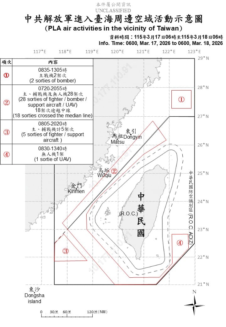 國防部今(18)日公布最新共機動態指出,17日全天至晚間期間,中共解放軍以「聯合戰備警巡」名義,在台海周邊展開高強度海空活動。整體統計顯示,累計偵獲共機36架次,其中24架次逾越海峽中線及其延伸線,進入我北部、中部、西南及東部空域,另有共艦8艘、公務船1艘同步活動,對台周邊空海域形成明顯壓力。