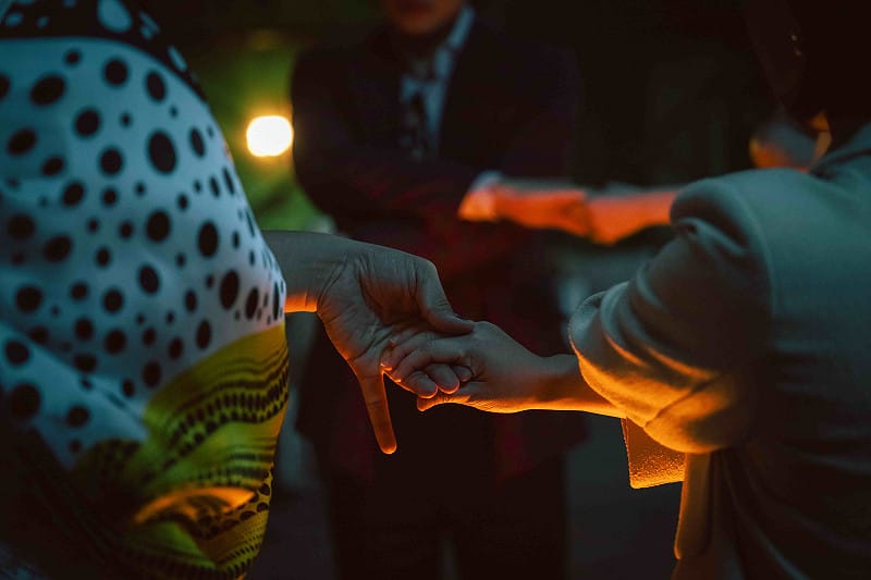 電影院禁播的〈牽手歌〉搭配牽手動作,更顯神秘詭異。 圖:網銀國際影視/提供