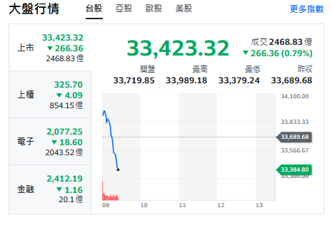 台股今天(20日)開黑走跌逾221點,最低來到33379點,約9點半,重要電子權值股F4,台積電跌5元、來到1845元。鴻海跌4.5元、來到200.5元。廣達跌3.5元、來到283元。聯發科跌10元、來到1670元。台達電跌35元、來到1420元。