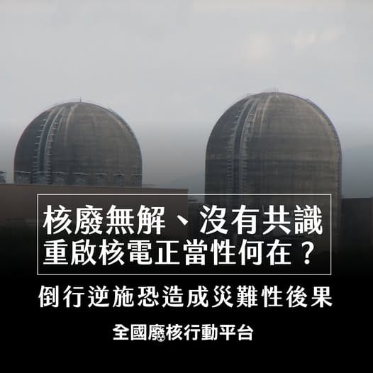 全國廢核行動平台呼籲,在核安風險未釐清、核廢無處可去、地方程序與社會共識均未建立前,不應預設核電重啟結果。核電能否重啟絕非政治喊話可決定。基於地質風險、老舊機組與核廢困境,平台堅決反對賴總統一意孤行,老舊核電不應重啟,能源轉型更不應倒退。