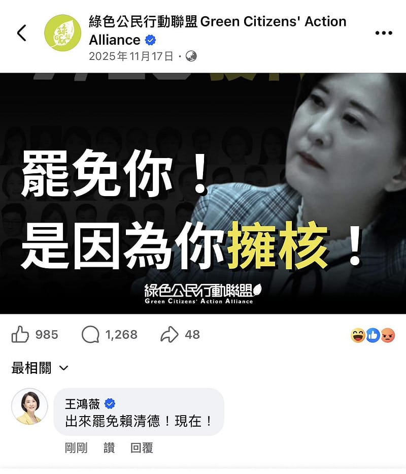 有趣的是,王鴻薇也進一步在「綠色公民行動聯盟」臉書貼文下方留言指出,過去因支持核電而遭罷免的案例,如今民進黨態度轉變,應以相同標準檢視,並點名要求「出來罷免賴清德」。她質疑,既然當初以支持核電作為罷免理由,如今政策轉向,相關團體是否也應採取一致標準。