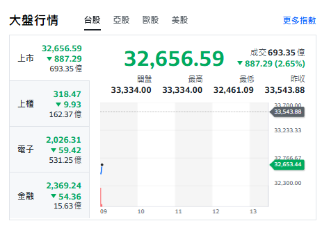 台股今天(23日)走跌跌逾887點,最低來到32461點。上櫃、電子與金融類股全下挫。重要電子權值股F4,台積電跌45元、來到1795元。鴻海跌7元、來到196元。廣達跌6元、來到277.5元。聯發科跌85元、來到1615元。台達電跌70元、來到1405元。