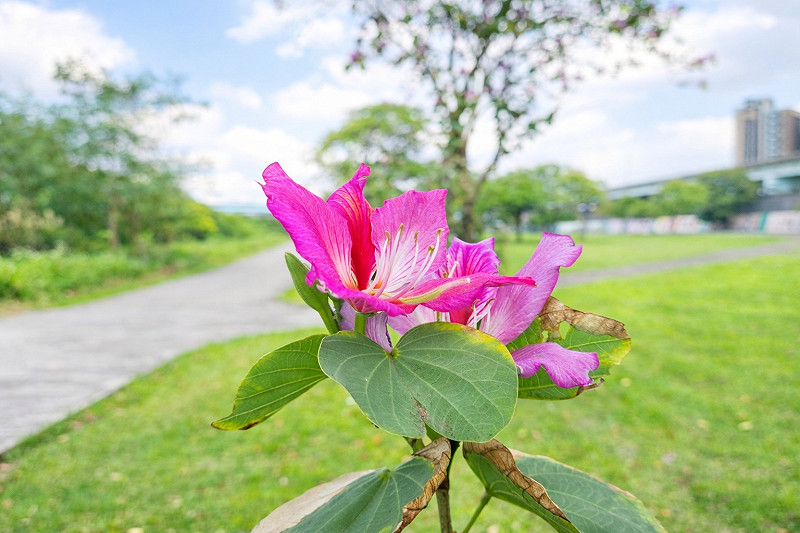 這種可愛的花朵名「羊蹄甲」,又名「香港蘭」或「洋紫荊」每年3月至5月為主要花期,花朵由5枚粉紅色花瓣組成,其中1枚帶有深紅色條紋,盛開時滿樹粉紅,宛如紅粉絲帶點綴河岸景觀。目前在江子翠河口景觀河濱公園及浮洲藝術河濱公園等地,羊蹄甲花況正盛,成為河濱最吸睛的春季拍照亮點。除賞花外,在浮洲藝術河濱公園「羊咩咩的家」,每日上午10時至10時30分及下午4時至4時30分開放免費餵食體驗,由牧羊人員提供牧草,賞花加上可愛小羊,適合親子一起同樂。