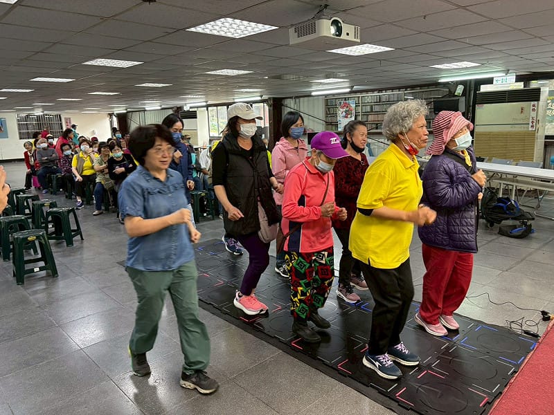 龍興社區長者於歡仔園活動中心體驗WhizToys電子運動地墊,在遊戲中訓練反應力與下肢活動能力。 圖:龍興社區發展協會 / 提供
