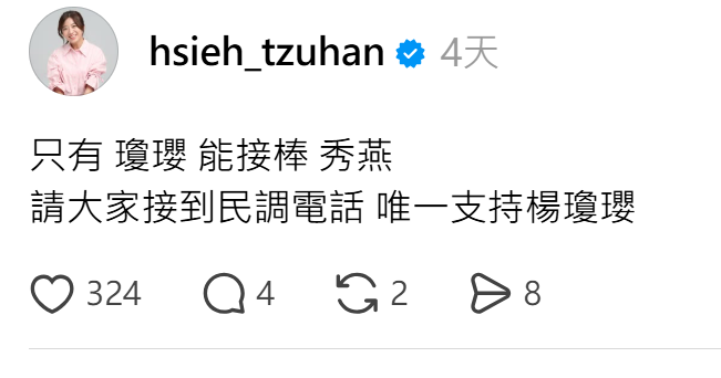 近日有不少被視為立場偏綠的社群都貼出「民調楊瓊瓔 台中換欣」的訊息,甚至幫忙做了「搶救楊瓊瓔」的圖片廣為宣傳」。其中有當時罷免立委羅廷瑋的團體,在表態支持楊瓊瓔後,還說了要支持楊瓊瓔的理由,「因為羅廷瑋支持江啟臣」。加上曾與楊瓊瓔競選過立委的前行政院副發言人謝子涵,日前在社群平台上他人的發文中留言,稱「只有瓊瓔能夠接棒秀燕」,都被解讀為綠營反串的動作。