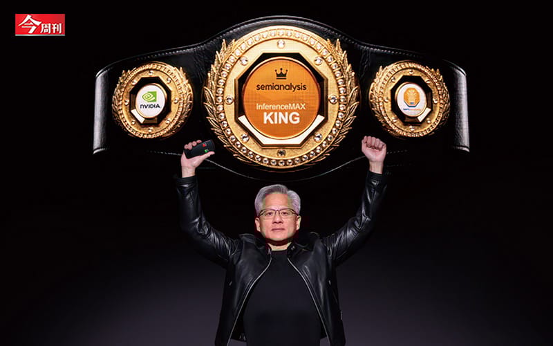 黃仁勳表示,在調研機構推論測試中表現最佳的,是輝達設計的Blackwell架構,綠白相間的企業識別,因此出現在印有「王者」(King)字樣的金腰帶上。
