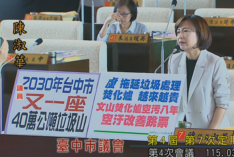 民進黨台中市議員陳淑華今(27)日在市議會針對文山焚化爐延宕、垃圾處理問題與市民負擔增加提出質詢,她表示文山焚化爐的整個更新計畫已拖延了 7 年,導致新增費用從原先林佳龍市長提出的 10 億升級方案,盧市長改為 BOT 後,竟增加到 94 億。