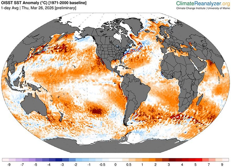 今日鄭明典在臉書上,分享「海溫距平圖」表示,「海洋熱起來了!」海洋持續升溫,雖然還未破2024年創下的絕對最高溫紀錄,但是以日曆天統計,現在已經進入有現代分析以來的最高溫狀態。也就是說,現在海溫已創下歷年同期新記錄。