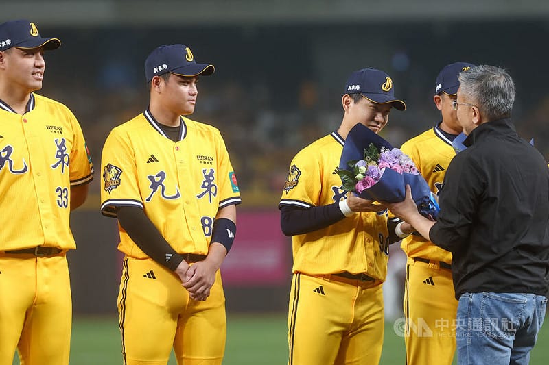 中華職棒37年開幕戰28日在台北大巨蛋舉行,賽前舉辦世界棒球經典賽隊職員表揚儀式,中職會長蔡其昌(右7)逐一獻花給兩隊參與的教練與選手。中央社記者張新偉攝 115年3月28日