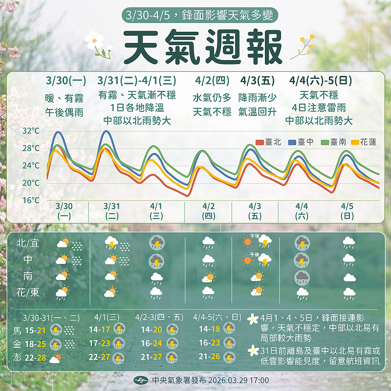 氣象署指出,明後天吹西南風,各地多雲到晴,僅花東有零星短暫陣雨,午後山區有零星短暫雷陣雨,北部地區白天28、29度,中南部白天32、33度;4月1日起連2波鋒面通過、東北季風稍增強,中部以北、東北部局部短暫陣雨或雷雨,午後山區局部短暫雷陣雨,其中中部以北清晨到上午有局部較大雨勢發生。