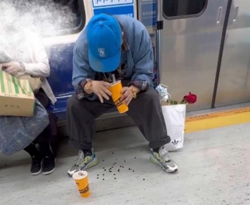 民眾錄下捷運車廂一幕,頭戴帽子老翁無視捷運車廂不能飲食的規定公然喝珍珠奶茶,並將口中珍珠吐在地上,甚至直接對著車廂地板亂吐,還將殘餘的珍珠吐到手上,隨後隨手撒向地面,後續更若無其事拿出衛生紙擦手,並將空杯子丟在座位下,隨即離開現場,誇張行徑令人瞠目結舌。
