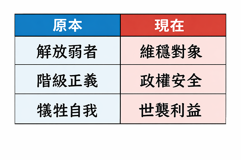 早期共產主義至少還有三個東西:對底層的真實同情、 願意為理念付出個人代價、對權力仍有某種不安感;但今天的中共,這三樣幾乎全部消失,被下面這三樣取代: