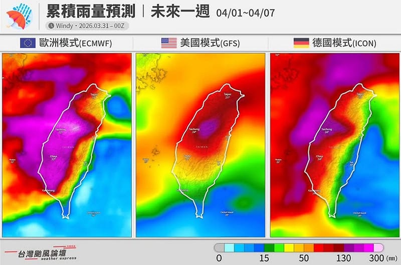 台灣颱風論壇說明,依據最新歐美日等多國數值模式,未來一週累積雨量預報雖在具體數字上仍存在若干差異,但三家模式共同指向同一結論:「未來7天全台多雨,尤其西半部紫紅一片,預計雨勢最多。」在各模式均有共識的情況下,台灣颱風論壇研判大局已定,此波春雨將是入春以來最明顯的一次。