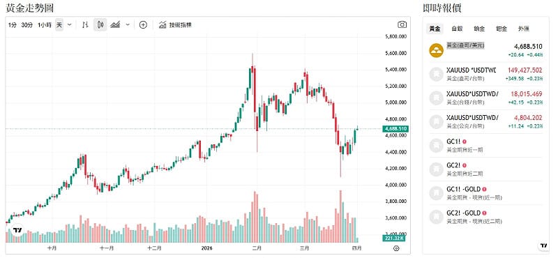 台銀表示,金價延續震盪走勢,後美元指數再度走高至100.5,金價承壓下行至4,530美 元附近,隨後美國總統川普表示,美軍已削弱伊朗海軍及飛彈實力,如能透 過外交手段促使荷莫茲海峽恢復通航,美國可望結束軍事行動,市場對衝突 結束的預期升溫,油價小幅下滑,金價再度上揚突破4,600美元。