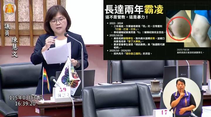陳慧文表示,依據受害家長與家長會提供之資訊,該名特教生在3年級、4年級與6年級期間持續面臨不當對待。以過往處理兒少保護案件之比例原則檢視,校方針對長達兩年的違規行為僅記一支申誡,處置顯不合理。她說,更嚴重的是,家長證實受害者不只一人,代表該教師的教學方式對整體資源班學生皆構成潛在風險,市府教育局應立即指派第三方調查委員介入,擴大清查其他受害學生,若確認為不適任教師應令其退出校園,以維護兒少法保障之基本權益。