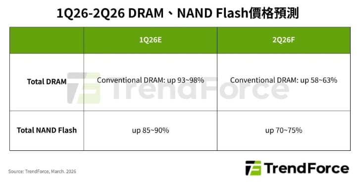 根據TrendForce最新記憶體價格調查,2026年第二季因DRAM原廠積極將產能轉向HBM、server應用,並採「補漲」策略拉近各類產品價差,儘管終端市場面臨出貨下修風險,預估整體一般型DRAM(conventional DRAM)合約價格仍將季增58-63%。NAND Flash市場持續由AI、資料中心需求主導,全產品線連鎖漲價的效應不減,預計第二季整體合約價格將季增70-75%。