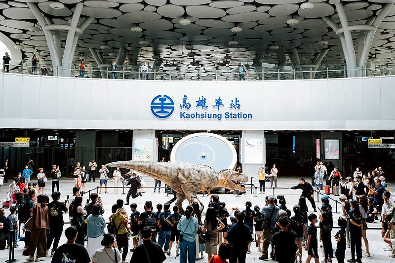 擬真恐龍現身高雄車站,吸引往來旅客與民眾目光。 圖:高雄市教育局/提供