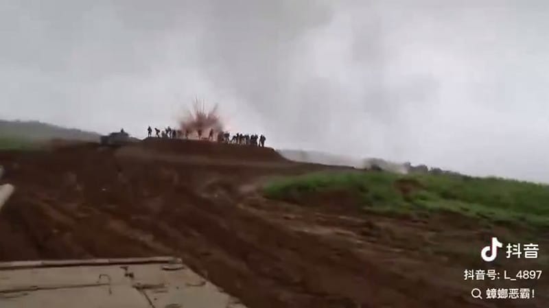 X 推主「李老師不是你老師」、「新聞調查」指出,一段疑似解放軍軍事演習的影片近期在中國短影音平台「抖音」上瘋傳,引發海內外網友廣泛關注。影片中,一輛解放軍 ZBD-04A 步戰車持續向前移動,車輛右前方一處高台上站有多名高官、幹部視察演習過程。沒想到,該輛步戰車在移動過程中意外朝著幹部們站立的高台土丘發射一枚煙霧彈,錄製影片的解放軍士兵也忍不住驚呼「完了完了」、「太尷尬了」。