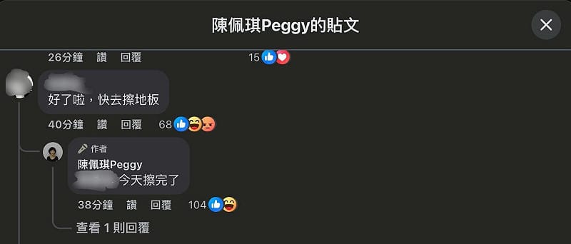 民眾黨創黨主席柯文哲涉京華城、政治獻金等案,3月26日一審判決出爐,遭判17年徒刑、6年褫奪公權。北院昨公布法庭言詞辯論、宣判過程影音,其中,柯在答辯哽咽稱家中沒有傭人,並指自己目睹妻子陳佩琪跪著擦地板,引發網友熱議。陳佩琪今(1日)再度於臉書發文批評司法,遭網友大酸「好了啦,快去擦地板」,陳佩琪親回「今天擦完了」。