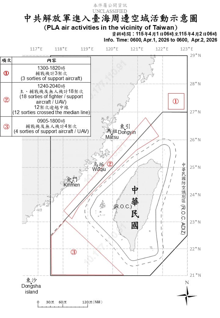 國防部指出,該批共機行動範圍涵蓋多個方向,包含北部空域、中部空域及西南防空識別區(ADIZ),呈現多點、多批次進行。依照國防部公布的示意圖顯示,共機活動分為三個時段與區域,其中主、輔戰機及無人機共計18架次活動最為密集,並有12架次逾越海峽中線,對區域安全造成壓力。