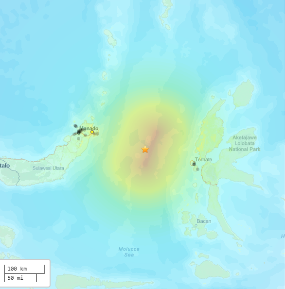印尼周邊海域於今日清晨6點48分,發生規模7.4強震,震央位於印尼特爾納特(Ternate)西北西約119公里處,震源深度35公里。地震發生後,美國海嘯預警系統預測,印尼部分沿海地區的海浪浪高可能達到30公分至1公尺。太平洋海嘯預警中心也示警,印尼、菲律賓和馬來西亞沿海地區等距離震央1000公里的範圍內可能出現海嘯。