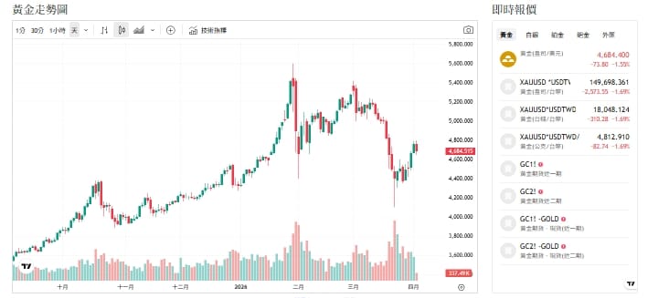 美國總統川普積極暗示美國已達基本的軍事目標,美軍不久將從中東地區撤出,後續將由其他國家負責重新開放荷姆茲海峽,緩解市場對油價高漲擔憂,美元指數同步回落至99.5附近,提振金價延續前一日長紅反彈氣勢,突破4,700美元後於 4,700-4,710美元區間波動。截至今天(2日)下午12點前,黃金交易價來到4678(盎司/美元)。