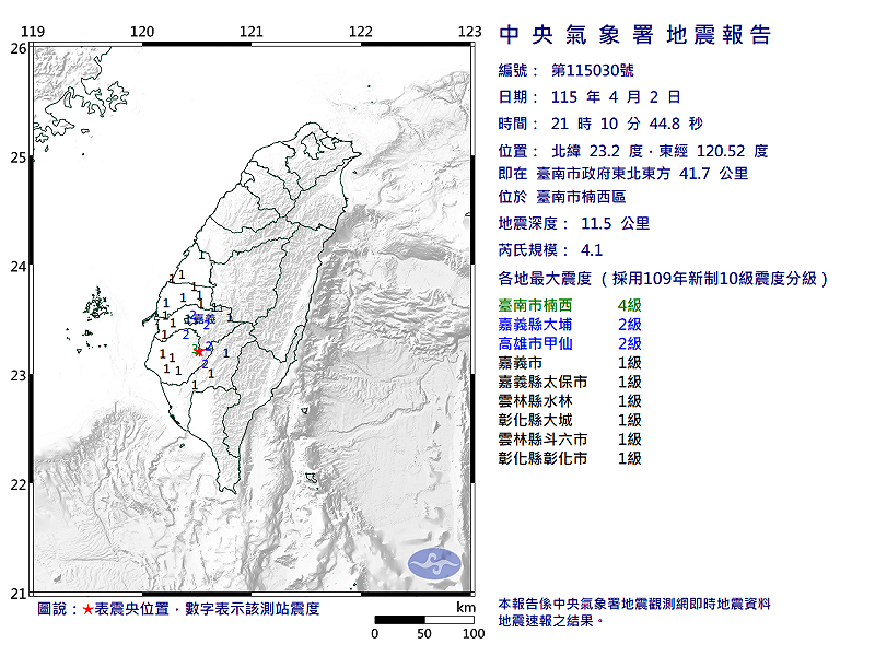 根據中央氣象署資料,04/02-21:10發生芮氏規模4.1有感地震 ,震央位於北緯 23.2度、東經120.52度,地震深度為11.5公里 ,相對位置在臺南市政府東北東方 41.7 公里 (位於臺南市楠西區)。各地最大地震度級: