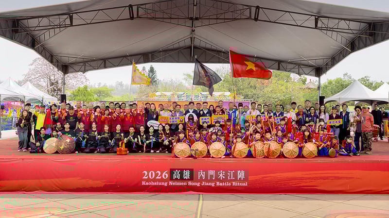 觀光局長高閔琳說明,2026高雄內門宋江陣「文武陣頭大匯演」,由在地歷史悠久的文武陣頭與各級學校進行演出,傳承內門在地豐富的文化內涵。今日表演隊伍「內門國小」,是區內唯一設有宋江陣社團的學校;讓小朋友從小扎根,並在潛移默化中學習在地文化與國家重要民俗,成為宋江技藝傳承的新生力量;「實踐大學」高雄校區則集結來自越南的國際學生,學習台灣宋江陣頭文化,並組成全新隊伍參加演出,呈現宋江陣文化跨國交流成果。