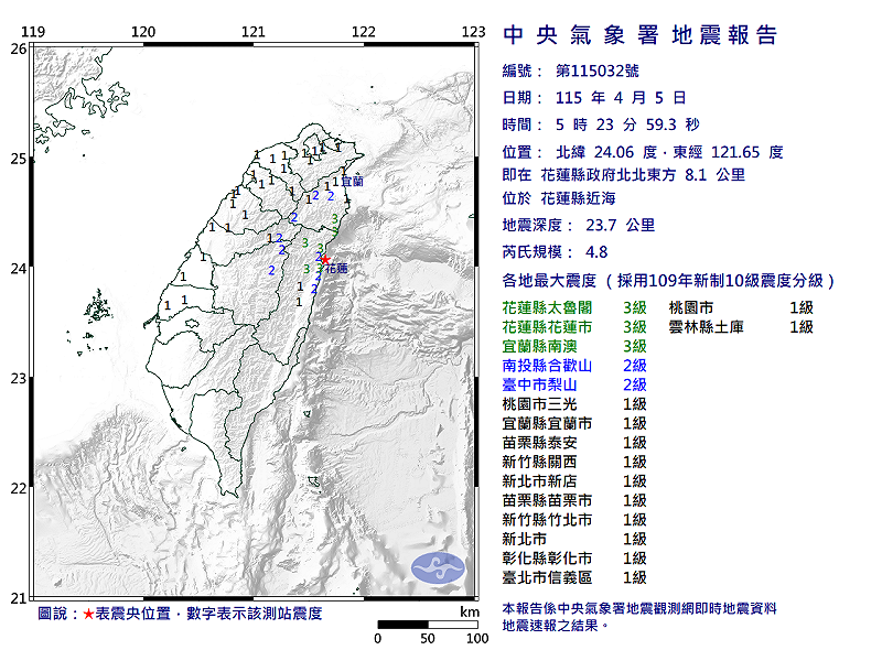 根據中央氣象署資料,04/05-05:23發生芮氏規模4.8有感地震 ,震央位於北緯 24.06度、東經121.65度,地震深度為23.7公里 ,相對位置在花蓮縣政府北北東方 8.1 公里 (位於花蓮縣近海)。各地最大地震度級: