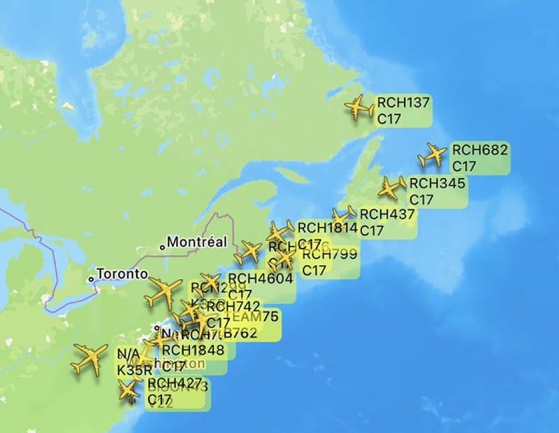 軍事專家王臻明指出,航空監控網站發現,有大批的C-17正從美國出發,飛越大西洋,同時間也有大批C-17從英國飛往中東地區。 圖/王臻明的軍事頻道