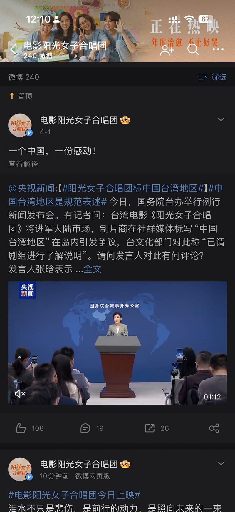 電影《陽光女子合唱團》昨(4)日在中國上映,因官方微博宣傳自稱為「『中國台灣』地區華語片影史票房冠軍」,引發矮化爭議並在台灣輿論掀起反彈。中國國台辦對此說明,相關表述符合「一個中國原則」,相關標註屬正常合理;不過,劇組官方微博隨後轉發並置頂國台辦回應,再度引發爭議。