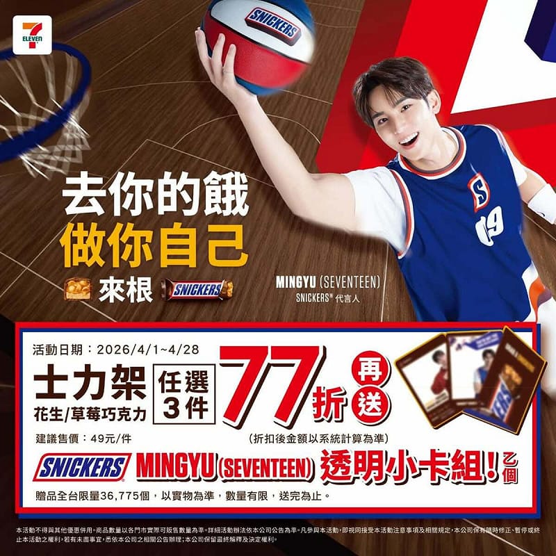 本次活動自4月1日起至4月28日止,消費者於全台7-ELEVEN門市購買「士力架花生巧克力」或「士力架花生可可棒-草莓」,任選3件商品即可享77折優惠。完成購買後,還可獲贈MINGYU透明小卡乙組。