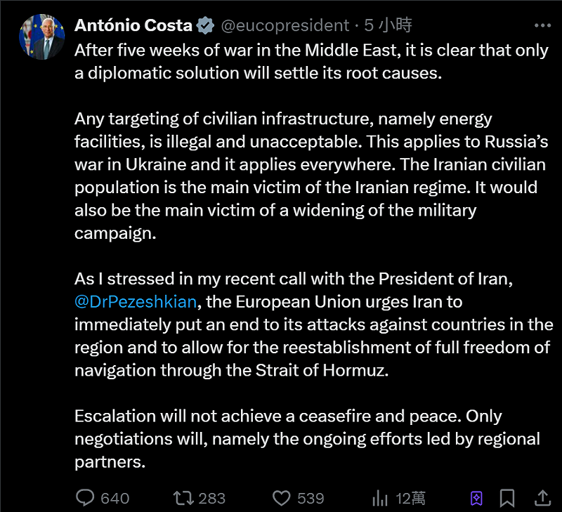 美國總統唐納·川普日前揚言,若伊朗不重啟荷莫茲海峽通行,將對其發電廠與橋梁發動攻擊,引發國際高度關注。對此,歐盟理事會主席安東尼奧·柯斯塔6日在社群平台X發文,強調唯有外交途徑才能解決衝突根源,並直指攻擊民用基礎設施「非法且不可接受」。