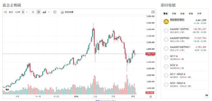 台銀表示,不久因市場悲觀情緒濃厚,壓抑金價跌勢再起回落至4,550 美元。歐美時段,儘管有部分買盤逢低入場使金價反彈至約4,650美元,但無法儘快結束中東戰爭打擊投資人信心,每桶原油價格也突破110美元,加上稍晚美國發表初領失業救濟金人數優於預期,賣壓再度籠罩金市,迫使金價多次跌破4,600美元,但稍晚美股開盤後三大股指紛紛下挫,資金回流金市帶動金價站上4,660美元。