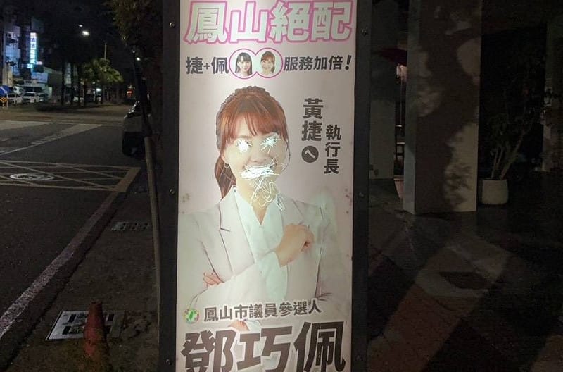 高雄市鳳山區市議員候選人鄧巧佩位於公正路口的公車站牌廣告,日前疑似遭不明人士刻意破壞。鄧巧佩今(7)日下午已前往瑞隆派出所完成筆錄,警方已受理,後續將調閱周邊監視器追查。