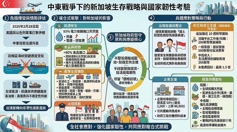 自2026年2月28日美國與以色列對伊朗發動軍事打擊以來,中東局勢迅速升高,並由區域軍事衝突外溢為全球能源、航運與供應鏈風險。對新加坡而言,這場危機所帶來的,不僅是油價與運費上揚,更是整體經濟運作成本、民生負擔與國家安全風險同步升高的複合式衝擊。