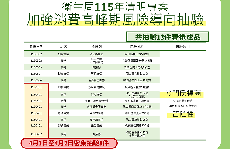 另針對外界質疑高雄市政府衛生局2026年「兒童清明專案」檢驗品項不足,衛生局也說明,相關抽驗並非僅為例行性抽驗,而是因應清明節前春捲、潤餅進入消費高峰期,另於4月1日及2日啟動加強風險導向抽驗,針對多處春捲攤商販售成品密集加驗8件。連同專案首批原已完成檢驗41件,清明專案累計抽驗49件。其中春捲成品共13件,抽驗地點涵蓋全市11個行政區,均依衛生標準檢驗沙門氏桿菌、金黃色葡萄球菌及李斯特菌等項目,結果均合格,媒體所稱「完全未檢驗沙門氏菌」與事實不符。