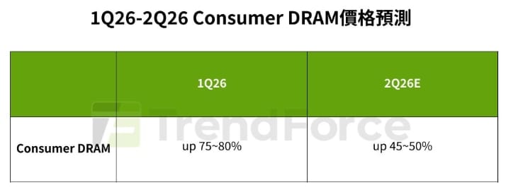根據TrendForce最新記憶體產業研究,大廠逐步退出成熟DDR4以下產品製造的策略不變,在市場供給結構持續收斂下,過去幾個月整體價格已累積驚人漲幅。TrendForce考量供給持續縮減,以及訂單轉移,但台廠產能擴張不及等因素,預估2026年第二季consumer DRAM合約價格仍將持續季增45-50%。